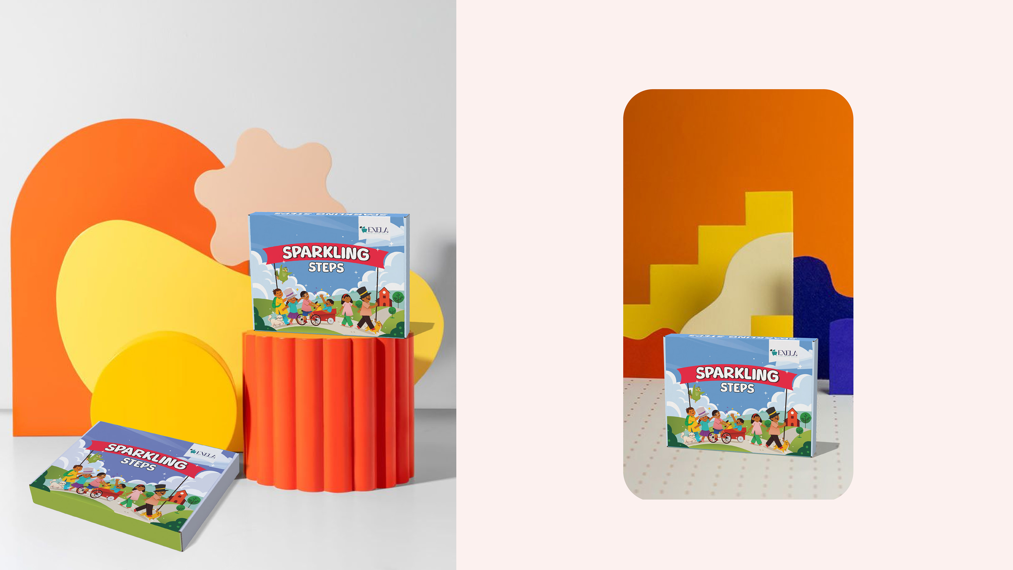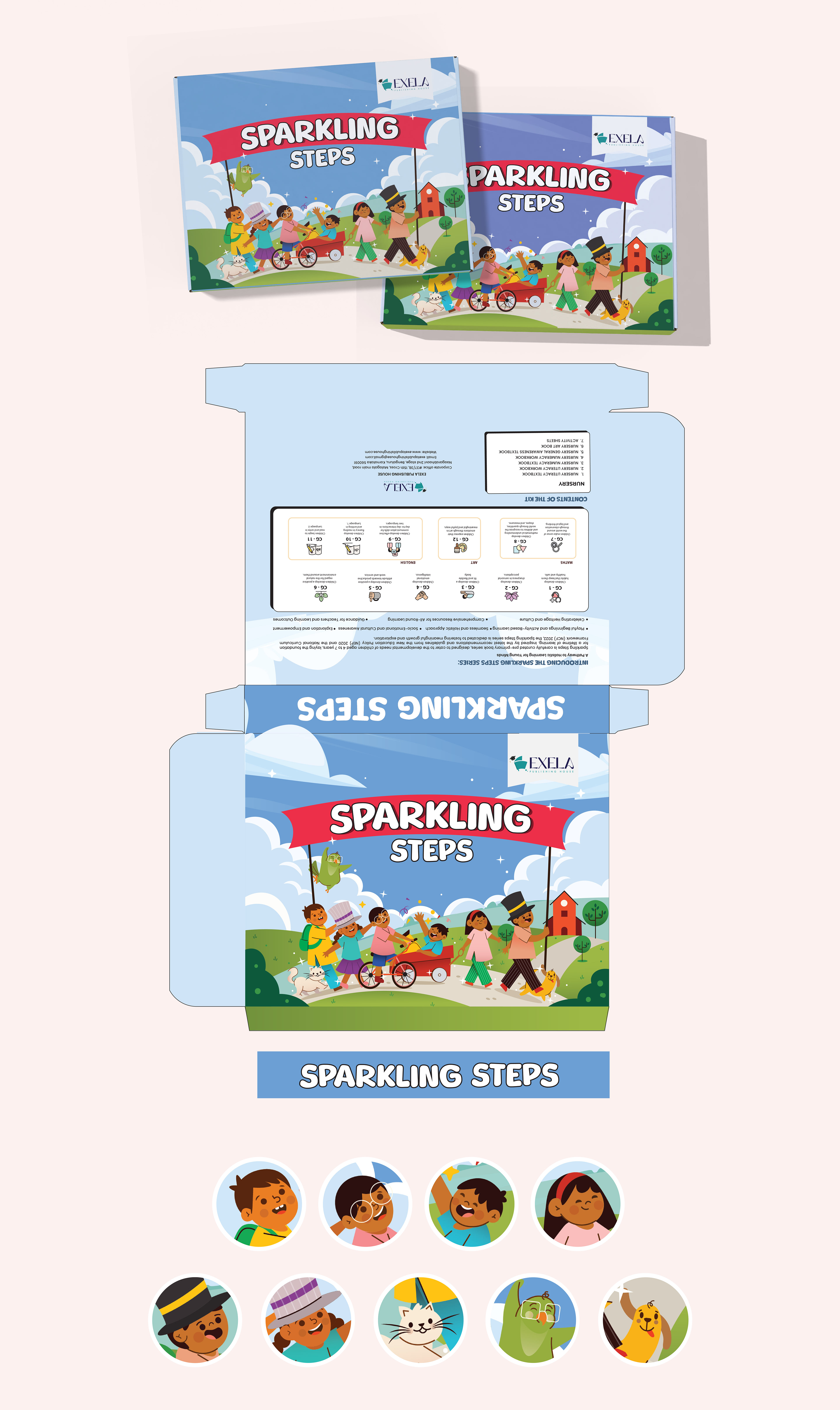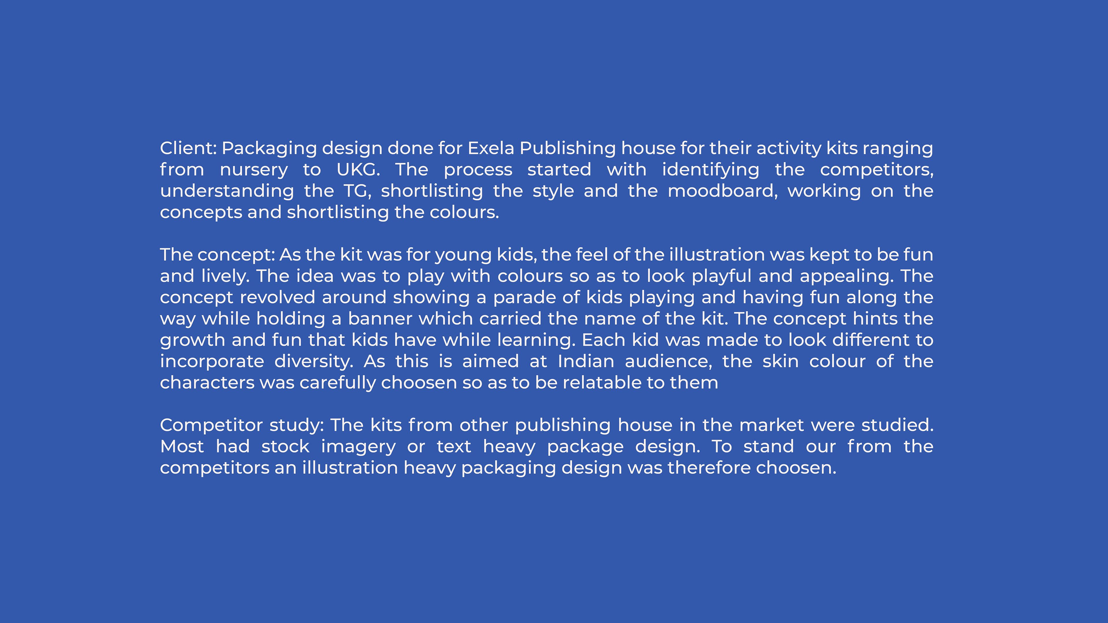 Activity kit Packaging design done for Exela Publishing house. The scope involved designing the box for three grade - nursery, LKG, UKG. The box was designed keeping the indian TG in mind. The process involved - competitor study, moodboard, concept selection, final colour and illustration render